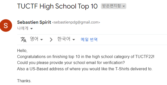 대충 요렇게 생겨먹은 이메일 헤더라는게 있는걸 알게 되었다. 아까 설명에 이 사이트에 대한 귀하의 이메일은 어디에 있습니까? 이런 질문이었기 때문에 아무 이메일이나 넣으면 안되고 tuctf.com으로 끝나는 메일 주소를 넣어야 한다.