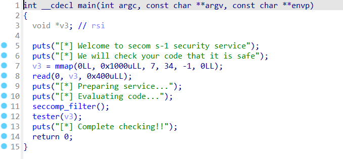 main함수 보면 mmap으로 rwx인 메모리 공간을 할당해주고 입력받는다.