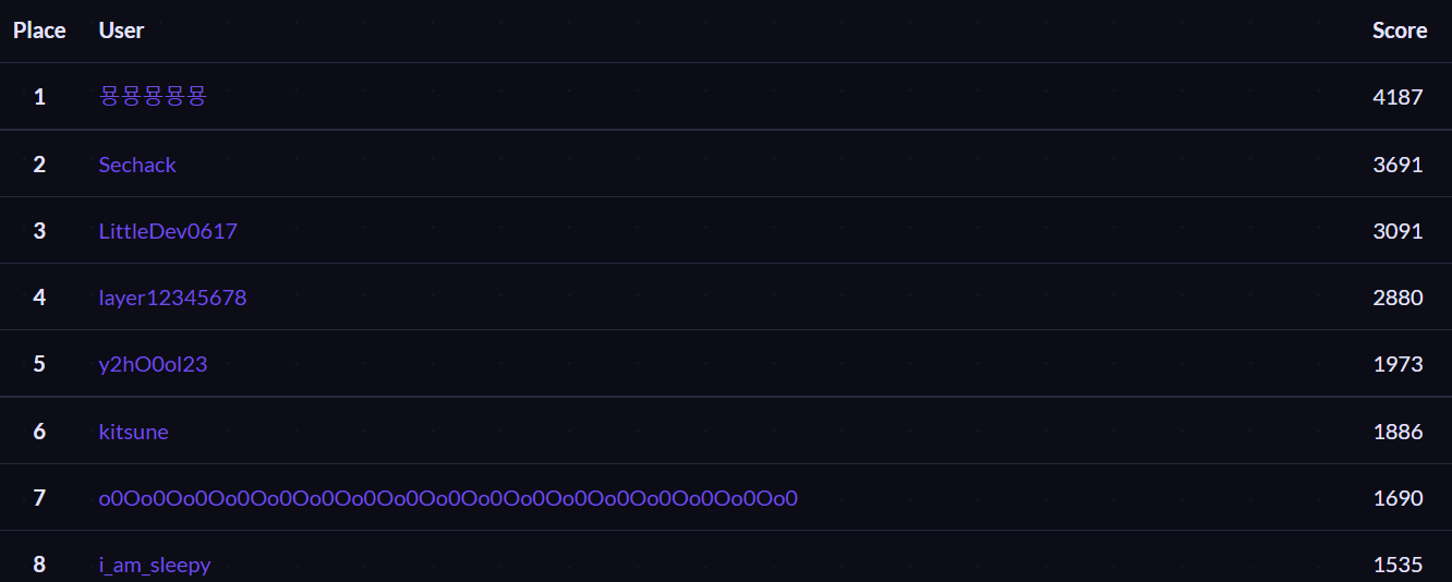 이번 Layer7 CTF는 고등부 1등을 했다. 작년에도 중등부 1등 해서 상받았었는데 연속으로 1등해서 기분이 좋다. 아무거나 한문제만 더풀었으면 위에있는 Ainsetin이라는 사람도 이길 수 있었는데 이건 조금 아쉽긴 하다.