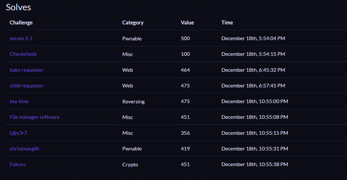 그리고 스코어보드 그래프와 플래그 인증 시간 보면 알겠지만 5문제를 플래그 키핑하고있다가 끝나기 5분전에 싹다 인증해서 순위 급상승 시켰다. 플래그 키핑 한번 해보고 싶었는데 이번에 처음 해봤다. secom S-1은 퍼블 마려워서 키핑 안했고 Checkcheck는 그냥 mic check니까 인증해줬고 baby requester문제를 풀어야 child requester문제가 보인다길래 그냥 푸는김에 같은 시리즈니까 그 두개도 인증해줬다. 나머지는 끝까지 키핑하다가 인증..ㅎㅎ