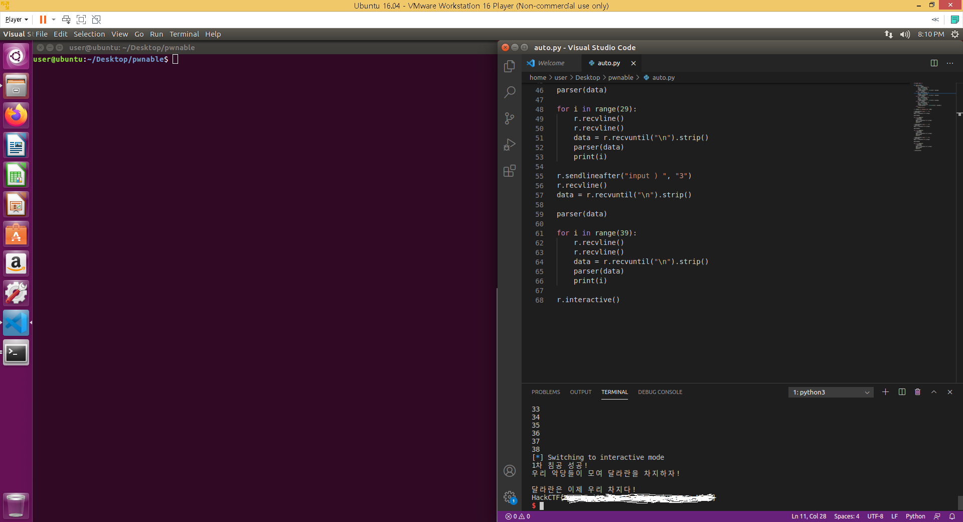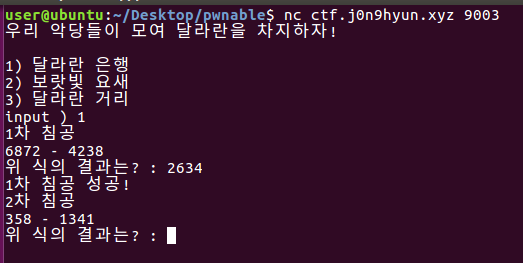 nc서버 하나 주길래 접속해보니까 3개의 메뉴가 있다. 1번을 선택해보니까 간단한 사칙연산이 나온다. 계산기로 계산하고 보내보니까 1차 침공 성공이라면서 2차 침공을 하라고 또다시 수식을 준다. 사칙연산 노가다 문제로 추측해볼 수 있다. 3개의 메뉴 전부 봤는데 전부 계산 노가다였다. 그래서 바로 pwntools를 이용해서 자동화 스크립트 짜줬다.