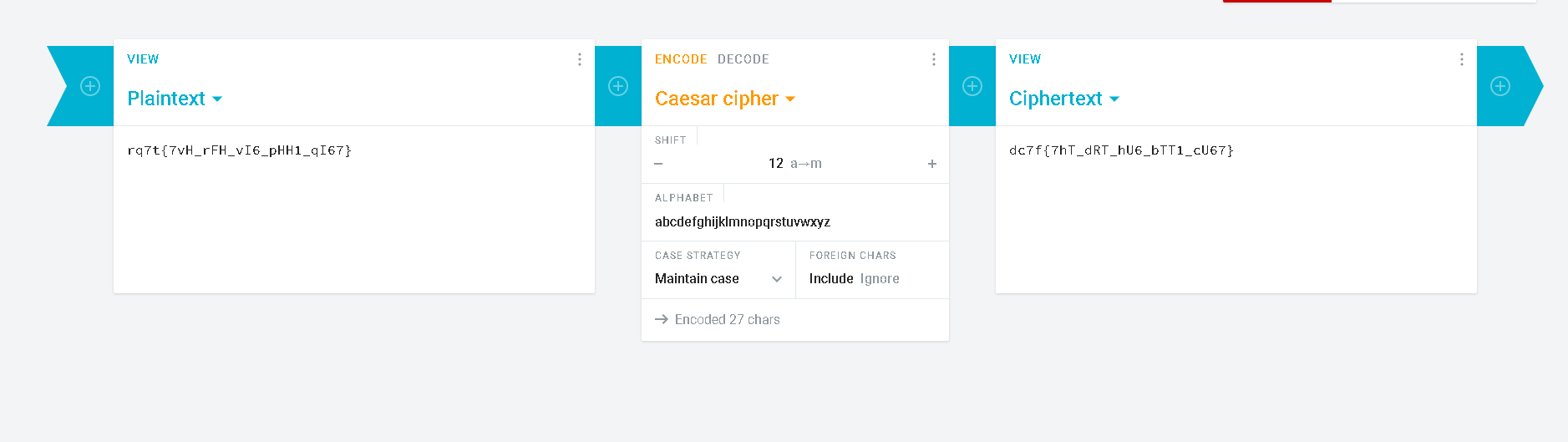DCTFTH3D13H4SB33NC4ST 라고 나오는데 암호화된 플래그는 rq7t{7vH_rFH_vI6_pHH1_qI67}였다. 아마도 사이트에서 소문자도 대문자로 표기해주는듯 했다. 그래서 암호화된 원본 플래그에서 소문자인건 소문자로 바꿔주고 숫자나 대문자인건 그냥 냅뒀다. 최종적으로는 dctf{Th3_d13_h4S_b33N_c4ST}가 나온다. 인증해주니까 성공 떴다.