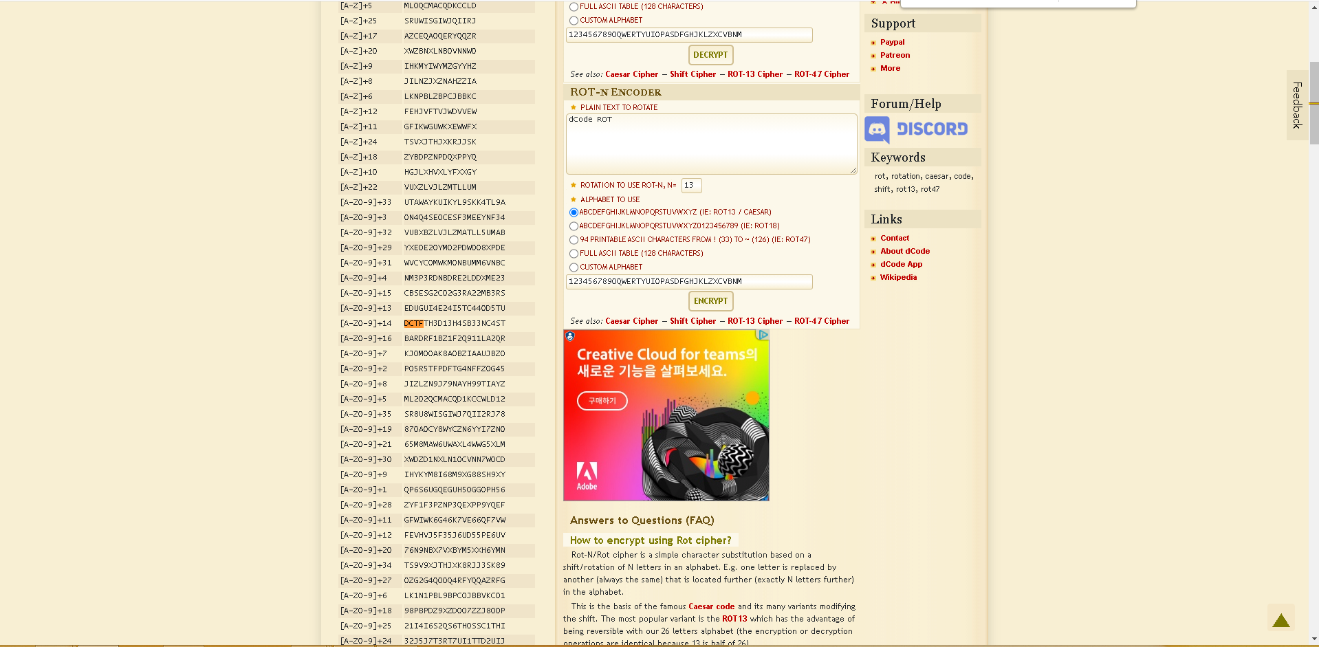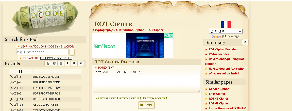 그래서 ROT디코더에 넣고 brute force옵션으로 돌려봤다. 파이썬 스크립트를 짜야되는데 귀찮아서 그냥 사이트에서 했다.