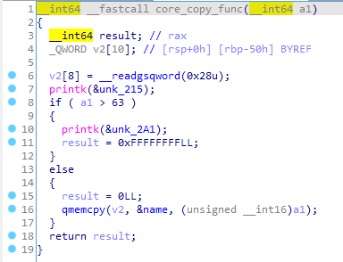 core_copy_func함수이다. 인자로 입력받은 size만큼 qmemcpy함수를 이용해서 전역변수의 값을 스택에 복사한다. 여기서 자세히 보면 또 하나의 취약점이 발생하는데 인자로 받는 size는 signed타입이지만 63보다 큰지 검증을 하고나서 else문으로 빠지고 qmemcpy함수의 인자로 전달될때는 unsigned형태로 바뀌어서 들어가게 된다. type casting으로 인해 발생하는 integer underflow로 인해서 stack buffser underflow를 트리거할 수 있게 된것이다. 그러면 우리는