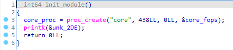 모듈이 로드되고 가장 처음에 실행되는 함수이다. proc_create함수가 있는데 core라는 이름의 드라이버를 /proc디렉터리에 생성하는 역할을 한다. 그리고 마지막 인자로 전달되는 core_fops를 보면