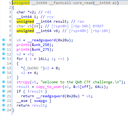 먼저 core_read함수이다. 여기서 사용되는 copy_to_user함수는 커널 영역의 메모리를 사용자 영역의 메모리로 복사할때 쓰이는 함수이다. 반대로 사용자 영역의 메모리를 커널영역으로 복사하고자 할때는 copy_from_user함수를 사용한다. 아무튼 첫번째 취약점은 저 copy_to_user함수에서 발생한다. 스택에 있는 v5변수의 인덱스로 off전역변수의 값을 사용하는데 앞서 core_ioctl함수에서 봤듯이 off전역변수를 마음대로 조작할 수 있다. 즉 oob로 인해서 임의 주소 leak이 가능해진다. IDA슈도코드로 봤을때 함수 프롤로그와 에필로그에 _readgsqword를 통해서 값을 비교하는걸로 보아 카나리가 있는 바이너리로 예상이 된다.