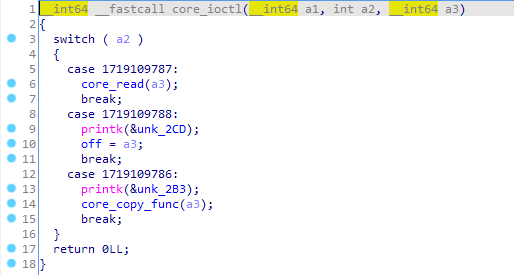ioctl함수, release가 정의되어 있는것을 볼 수 있다. 이 fops에 등록되어 있지 않으면 함수를 직접적으로 부르지 못한다. 지금 core_write가 등록되어 있는데 이걸 호출하려면 write함수에 open("/proc/core", O_RDWR)를 해서 반환된 fd를 넣어주면 해당 드라이버의 write가 호출이 되는 방식이다. 이제 한번 core_ioctl함수를 봐보자.
