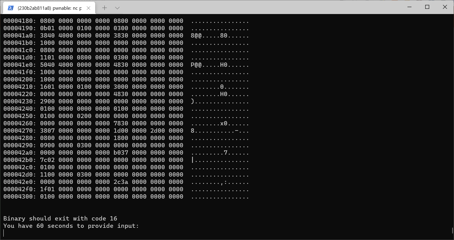 문제에서 주는 nc주소에 접속해보면 hexdump로 출력한듯한 내용을 준다. 그리고 60초 내에 입력을 줘야하고 프로그램의 exit code를 주어진대로 만들어야한다. 저걸 받아와서 IDA로 분석해보자.